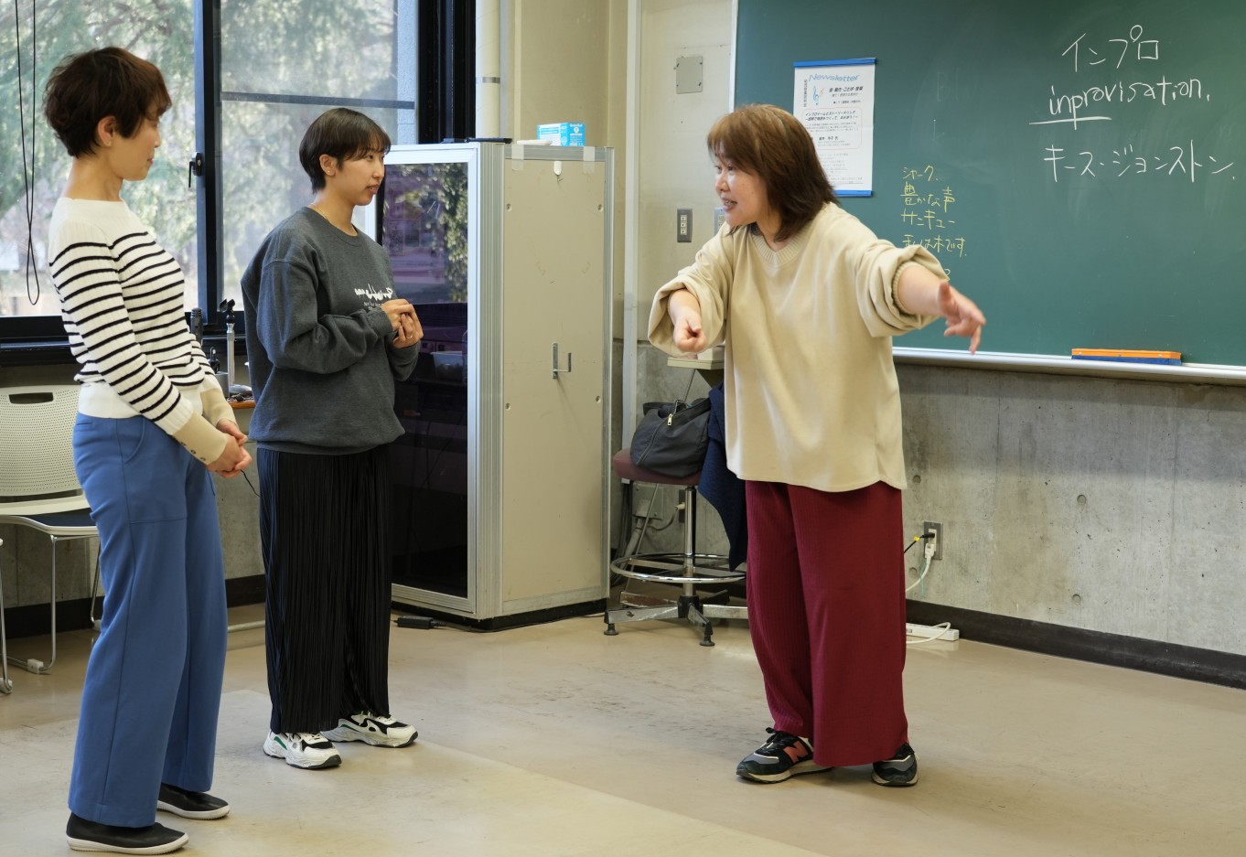 2025年度最後の例会は、直井玲子氏を講師に迎え、東京学芸大学にて開催されました。 直井氏は4年ぶり2回目の講師担当でした。 前回はオンラインでしたが、今回は待望の対面開催でした。 『インプロゲームとストーリーテリング―即興で物語をつくって、あそぼう』という題目で ワークショップが行われました。